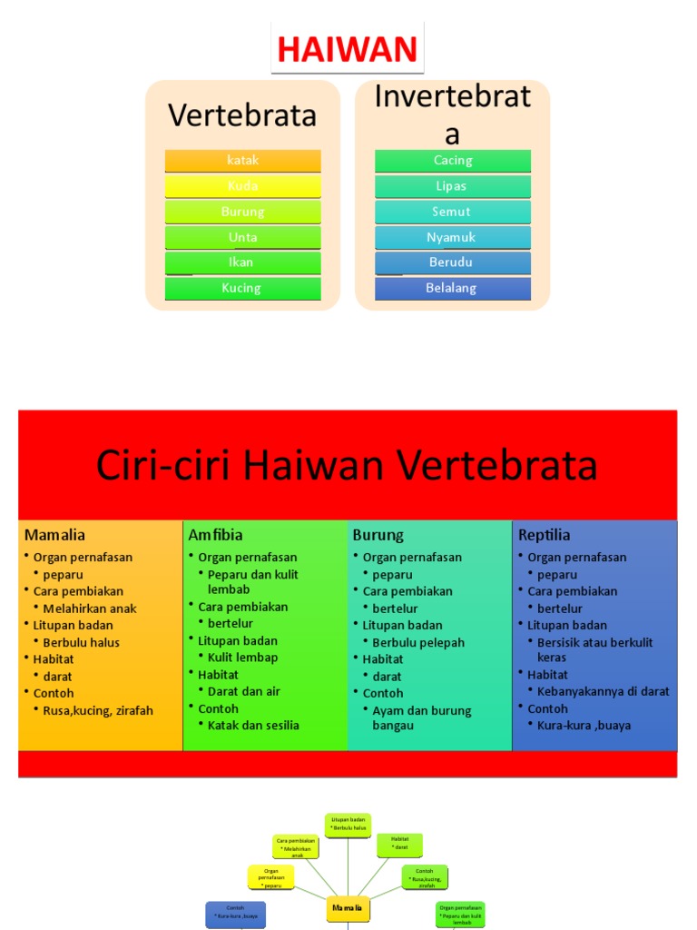 Hewan vertebrata terbagi menjadi dua yaitu pisced dan tetrapoda. 322 Ciri-ciri Khusus Haiwan Vertebrata Selain organ pernafasan cara pembiakan litupan badan dan habitat juga ialah ciri-ciri khusus yang boleh digunakan untuk mengelaskan haiwan. Dalam sistem klasifikasi vertebrata merupakan subfilum dari filum Chordata.